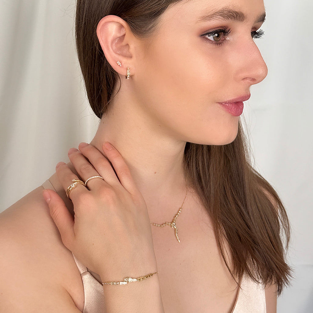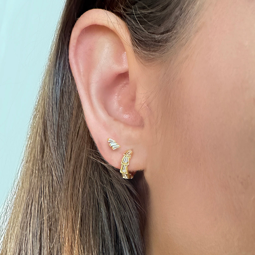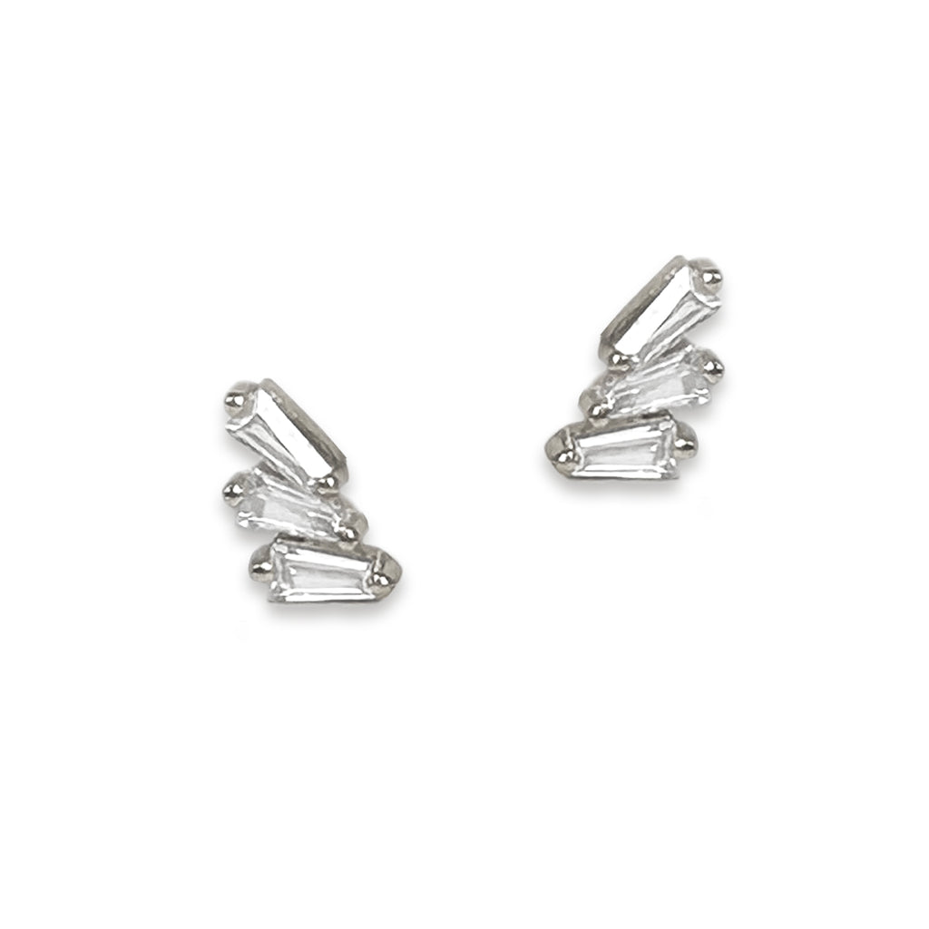A stack of three tapered baguette studs forms a delicate wing-like silhouette. Light enough for every day and perfect for stacking.