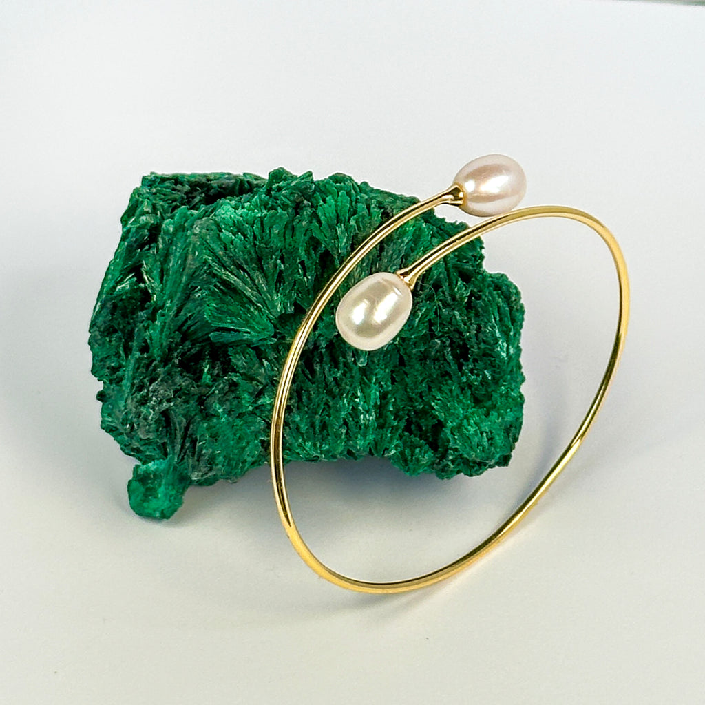 Twin oval shaped rice pearls sit at either end of this delicate overlap wire cuff, creating a graceful balance of modern minimalism and timeless elegance.